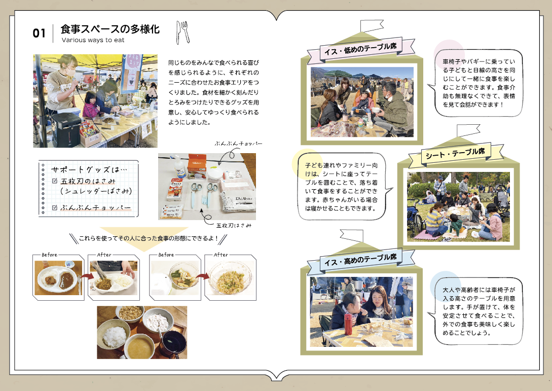 また、ぽかぽかキャンプが主催するユニバーサルデザイン活動として“ぽかぽかマルシェ🔗”というマルシェを開催されています。障がい当事者が気軽に出かけられる場所を創るため、食事、休憩スペース、トイレなど、ユニバーサルな視点で環境づくりをしたり、また当事者がマルシェのお店を手伝ったり、ご家族が運営に携わったりするなど、参画の機会を創っています。その内容が詳しく載っているパンフレットを作成しました。
